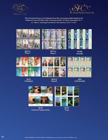 16Micro-Perforated Prayer Cards Imported from Italy, showcasing original designs by theStudios of Cromo NB (Milan, Italy). Each pack includes 125 sheets, measuring 8 1/2\11\%u00a92025 CROMO N.B. MILAN ITALY All Rights Reserved. Images Licensed By CNB Basevi Inc.8PTA1Pieta 18PTA2Pieta 28VERSerenity8LITLiturgical8UNIUniverse Nature Scene8VSTVista8SAC2Sacred8GSGod Serenity