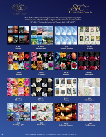 8CRECreation8CSS10Nature Caldo8GRGlorious Rainbow8GRDGarden8BSMBlossom8FRGFragrance8BOUBouquet8FLO2Flourishing14 %u00a92025 CROMO N.B. MILAN ITALY All Rights Reserved. Images Licensed By CNB Basevi Inc.Micro-Perforated Prayer Cards Imported from Italy, showcasing original designs by theStudios of Cromo NB (Milan, Italy). Each pack includes 125 sheets, measuring 8 1/2\11\8NATNature8SSSoft Shadows8GLGuiding Light8BRBiblia Rose8ILMIn Loving Memory8NFNot Forgotten8FLW2Flowers 28FLWFlowers