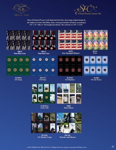 %u00a92025 CROMO N.B. MILAN ITALY All Rights Reserved. Images Licensed By CNB Basevi Inc. 17Micro-Perforated Prayer Cards Imported from Italy, showcasing original designs bythe Studios of Cromo NB (Milan, Italy). Each pack includes 125 sheets, measuring 81/2\8BLFThin Blue Line8FLFThin Red Line8ARM2US Army8NVY2US Navy8USMCUS Marine Corps8WAHWarrior and Heroes8ARMLSArmy Life8DHDuty Honor8SPGStar Spangled Banner8USAUSA8USM2US Marines8AIR2US Air Force
