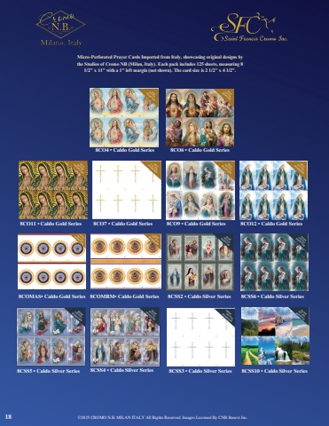 18 %u00a92025 CROMO N.B. MILAN ITALY All Rights Reserved. Images Licensed By CNB Basevi Inc.Micro-Perforated Prayer Cards Imported from Italy, showcasing original designs bythe Studios of Cromo NB (Milan, Italy). Each pack includes 125 sheets, measuring 81/2\8COMRM%u2022 Caldo Gold SeriesHOT FOILGOLDDECORATIONGOLDDECORATIONHOT FOILHOT FOILGOLDDECORATION8COMAS%u2022 Caldo Gold Series8CSS10 %u2022 Caldo Silver SeriesSILVERHOT FOILDECORATION8CO7 %u2022 Caldo Gold SeriesHOT FOILGOLDDECORATION8CSS3 %u2022 Caldo Silver SeriesSILVERDECORATIONHOT FOIL8CSS6 %u2022 Caldo Silver SeriesSILVERHOT FOILDECORATION8CSS2 %u2022 Caldo Silver SeriesSILVERHOT FOILDECORATION8CO11 %u2022 Caldo Gold SeriesHOT FOILGOLDDECORATION8CO12 %u2022 Caldo Gold SeriesGOLDHOT FOILDECORATIONGOLDHOT FOILDECORATION8CO9 %u2022 Caldo Gold Series8CSS4 %u2022 Caldo Silver SeriesSILVERHOT FOILDECORATIONSILVERHOT FOILDECORATION8CSS5 %u2022 Caldo Silver Series8CO6 %u2022 Caldo Gold SeriesHOT FOILGOLDDECORATION8CO4 %u2022 Caldo Gold SeriesHOT FOILGOLDDECORATION