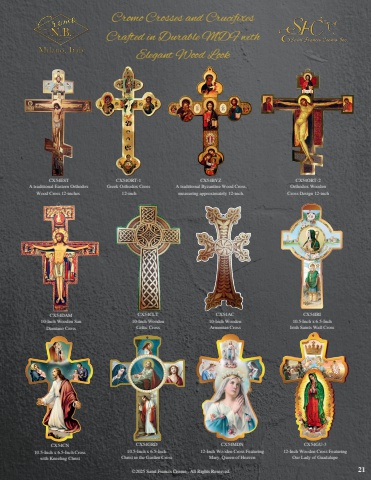 Cromo Crosses and CrucifixesCrafted in Durable MDF withElegant Wood LookCX54CLT10-Inch WoodenCeltic CrossCX54DAM10-Inch Wooden SanDamiano CrossCX54AC10-Inch WoodenArmenian CrossCX54ORT-1Greek Orthodox Cross12-inchCX54BYZA traditional Byzantine Wood Cross,measuring approximately 12-inch.CX54ORT-2Orthodox WoodenCross Design 12-inchCX54ESTA traditional Eastern OrthodoxWood Cross 12-inchesCX54IRI10.5-Inch x 6.5-InchIrish Saints Wall CrossCX54CN10.5-Inch x 6.5-Inch Crosswith Kneeling ChristCX54GRD10.5-Inch x 6.5-InchChrist in the Garden CrossCX54MDN12-Inch Wooden Cross FeaturingMary, Queen of Heaven%u00a92025 Saint Francis Cromo . All Rights Reserved. 21CX54GU-312-Inch Wooden Cross FeaturingOur Lady of Guadalupe