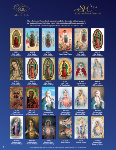 %u00a92025 CROMO N.B. MILAN ITALY All Rights Reserved. Images Licensed By CNB Basevi Inc.8GUOur Ladyof Guadalupe8GU4Our Ladyof Guadalupe8CZEOur Ladyof Czestochowa8IHM5ImmaculateHeart of Mary8GUMOur Ladyof Guadalupe8GU5Our Ladyof Guadalupe8CZE2Our Ladyof Czestochowa8IHM6ImmaculateHeart of Mary8GUFOur Ladyof Guadalupe8GU7Our Ladyof Guadalupe8IHM1ImmaculateHeart of Mary8AMImmaculateHeart of Mary8SJDSaint Juan Diego8GU8Our Ladyof Guadalupe8TWHTwin Hearts8IHM2ImmaculateHeart of Mary8QMQueen Mary8COROur Lady ofCoromoto8GUDOur Ladyof Guadalupe8IHM3ImmaculateHeart of Mary8GU3Our Ladyof Guadalupe8OPROur Ladyof Providence8IHM4ImmaculateHeart of Mary4Micro-Perforated Prayer Cards Imported from Italy, showcasing original designs bythe Studios of Cromo NB (Milan, Italy). Each pack includes 125 sheets, measuring 81/2\8IMM2ImmaculateHeart of Mary