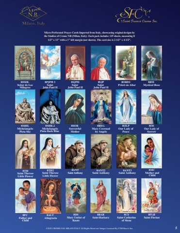8BARSaint Barbara%u00a92025 CROMO N.B. MILAN ITALY All Rights Reserved. Images Licensed By CNB Basevi Inc. 58ALTAltagracia8MHLMichelangeloPieta Sky8THSaint ThereseLittle Flower8DSMary Untier ofKnots8PJPII 3SaintJohn Paul II8TH2Saint ThereseLittle Flower8MHL2MichelangeloPieta Dark Blue8SORSorrowfulMother8ANTSaint Anthony8SJPIISaintJohn Paul II8ANT2Saint Anthony8REGMary Crownedby Angels8CSSaint Catherineof Siena8MCMother andChild8SJPSaintJohn Paul II8FLRSaint Florian8OLPOur Lady ofPeace8ORD1 Priest on Altar8FCFather andChild8OSOur Lady ofSorrow8SMILSe%u00f1or de LosMilagros8RMMystical RoseMicro-Perforated Prayer Cards Imported from Italy, showcasing original designs bythe Studios of Cromo NB (Milan, Italy). Each pack includes 125 sheets, measuring 81/2\8ANT3Saint Anthony