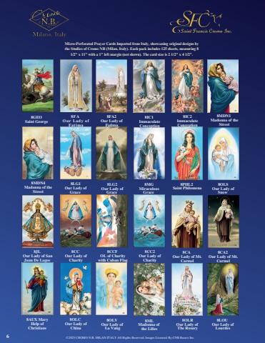 6 %u00a92025 CROMO N.B. MILAN ITALY All Rights Reserved. Images Licensed By CNB Basevi Inc.8MGMiraculousGrace8FAOur Lady ofFatima8OLCOur Lady ofChina8CCOur Lady ofCharity8LG1Our Lady ofGrace8FA2Our Lady ofFatima8LG2Our Lady ofGrace8OLVOur Lady ofLa Vang8CCFOL of Charitywith Cuban Flag8IC1ImmaculateConception8MLMadonna ofthe Lilies8CAOur Lady of Mt.Carmel8PHL2Saint Philomena8IC2ImmaculateConception8OLROur Lady ofThe Rosary8CA2Our Lady of Mt.Carmel8LOUOur Lady ofLourdes8OLSOur Lady ofSnow8MDN1Madonna of theStreet8AUX MaryHelp ofChristians8MDN4Madonna of theStreet8JLOur Lady of SanJuan De Lagos8CC2Our Lady ofCharityMicro-Perforated Prayer Cards Imported from Italy, showcasing original designs bythe Studios of Cromo NB (Milan, Italy). Each pack includes 125 sheets, measuring 81/2\8GEOSaint George